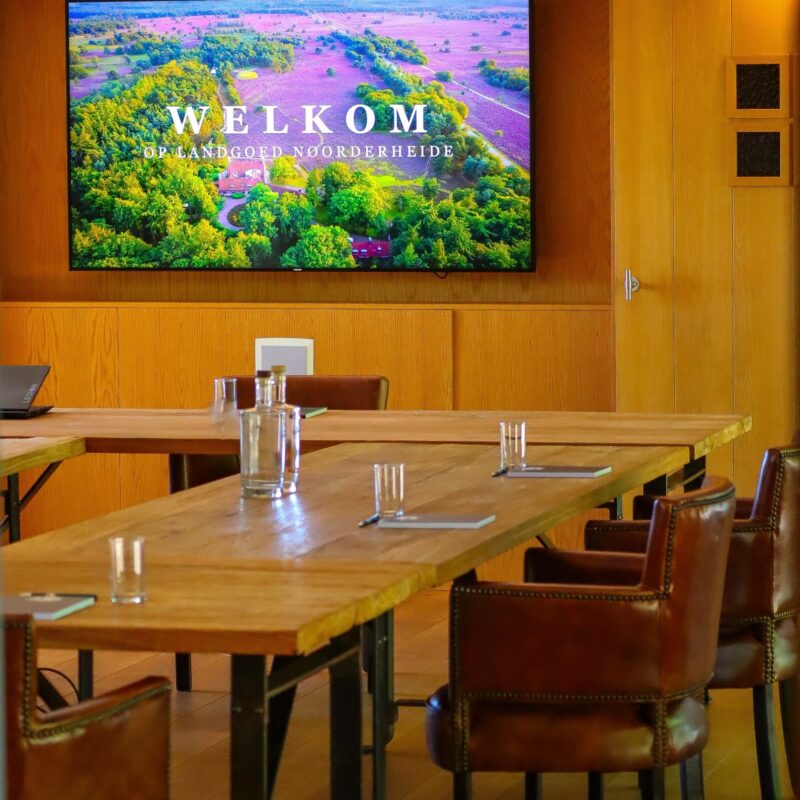 In de voormalige garagevleugel bevindt zich een moderne vergaderruimte voor groepen tot 24 personen. Afhankelijk van de wens kan de ruimte worden ingericht in verschillende opstellingen, zoals boardroomopstelling (tot 16 personen) of carréopstelling (tot 24 personen). De ruimte is volledig uitgerust met een groot scherm en een eenvoudige HDMI-aansluiting, geschikt voor presentaties en videobellen. Dankzij de eigen keuken met koffiezetapparaat wordt er vergaderd in alle rust en privacy.